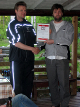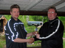 Ja jotta varmasti pysyttäis totuudessa, niin kyllähän siinä tietenkin seuraavana jaettiin kauden palkinnot, Vuoden Erotuomari (Jani, kukas muukaan, vaikka tiukan kaksivaiheisen vaalin jälkeen, johtokunnan suljetun äänestyksen jälkeen), Vuoden Aktiivi (tämä samainen höpöttäjä jolla joka asiaan on sanottavansa ja tyhmiäkin kommentteja eli allekirjoittanut), sekä Vuoden Tulokas (Kari Kääriäinen). Lisäksi palkittiin edistymisestä ja tuomarityön mallikkaasta hoitamisesta ensikertaa kunniakirjoin Juha Noronen, Juhani Kirves, Petteri Heimonen ja Markku Sundvall. Siinä sitten jaettin palkintoja, juteltiin lisää kaudesta ja pohdittiin lajin tulevaisuuden näkymiä hetki jos toinenkin. Ainakin osa palkituista oli loistavia, kuten palkintojen jakajakin, tässä kuvissa Antti jakaa ja Jani ottaa vastaan, muuten Jani hoiti kerhomme puheenjohtajana jakamispuolen (Kuvat 13-17).