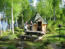 Perille päästyämme Jani viritteli musiikkimasiinat ja makkaratulet (Kuvat 3 ja 4) ja jäimme odotelemaan vielä yhtä autokuntaa, jolla paikalle saapuisivat loput juhlijat eli Reijo, Antti, Timo ja Jouni. Päivä oli lämmin ja juoma maittoi helteisessä säässä kaikille (Kuva 5), vaikka kaikki eivät paikalle olleetkaan saapuneet, mutta heillekin riittäisi kyllä ja tässä vaiheessa ei vielä kaikille ollutkaan selvinnyt, että loppuillasta 9 hengen retkueemme kutistuisi vain ”Top Alcohol” –porukkaan, eli Pekkaan, Kari-Pekkaan ja Jukkaan.