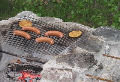 Ruokapuoli: pyttipannua kaikkine tykötarpeineen, tuoresalaattia ämpäritolkulla, valmissalaatteja, sämpylöitä ja leivänpäällisiä monen sorttisia ja kilokaupalla grillimakkaraa.