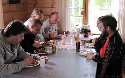 Allekirjoittaneen autokunta (+ Kuski-Juha ja Kimmo) tuli paikalle toisena, perillä olivat pyttistä ja salaatteja vääntämässä jo Pekka, Juhani, KP, Iiro ja Petteri (kait Iiro oli Pekan kyydissä tullut). Herrat jatkoivat touhujaan, Kimmo ja Juha heitä avustamaan, Jukka tekemään sytykkeineen (kolmen vuoden wc-paperihylsyt) tulta pihan grilliin makkaroita varten (harrastenuotio siitä tuli, mutta sytytettiin vain kerran kuitenkin…) Baari oli jo auki, ne ketkä eivät olleet autolla, tilkitsivät janoaa alkomaholeilla, autolliset saivat tyytyä Jaffaan, Pommakkiin tai veteen. Kohtasillään paikalle kaartelivat niin Lassen porukka (+Liimis ja Ronkku sekä IP) kuin Lari sekä Tonikin omilla autoillaan. Autoja pihassa pyörähti siis 6 kpl mutta aamulla pihassa ei ollutkaan yhtään, tästä myöhemmin lisää…