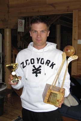 Iltapäivän tässä vaiheessa visojen jälkeen, oli palkintojenjaon vuoro. Palkituiksi tulivat vuoden erotuomari Lasse, vuoden naistuomari Leeni, vuoden tulokas Kimmo sekä vuoden aktiivi Sami, joka siis ilman omaa syytään oli jättänyt saapumatta, muuten aktiivikin olisi paikalla ollut. Kiitospuheet menivät tällä kertaa muodossa: ”pj-Juhani kyseli ja palkitut vastailivat kysymyksiin”. PJ:n tukevahkosta nousuhumalasta (sen siitä saa kun harjoittelee peri kertaa vuodessa, niin on 6 kpl 0,33l siidereitä ihan tuubassa!) huolimatta kysymykset olivat yllättävän selkeitä. Kumpainenkin paikalla olleista palkituista jutteli pitkään ja hartaasti, myös yleisö osallistui keskusteluun. Tässä vierähti varmaan tunti jos kohta toistakin, näin muistelen (mä olin harjoitellut jo tässä vaiheessa melkein 3x annoksella PJ:hin verrattuna, mutta harjoitus tekee metsurin, ei muistipeliä!) käyneen.